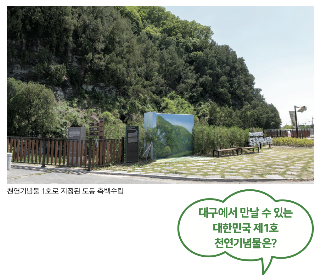 천연기념물제도를 처음 실시한 것은 1962년이었다. 이때 대구에 있는 자연유산이 대한민국 제1호 천연기념물로 지정되었는데, 60여 년이 지난 지금도 여전히 그 자리를 지키고 있다. 주인공은 바로 대구시 동구 산 180번지에 위치한 측백나무 숲.
