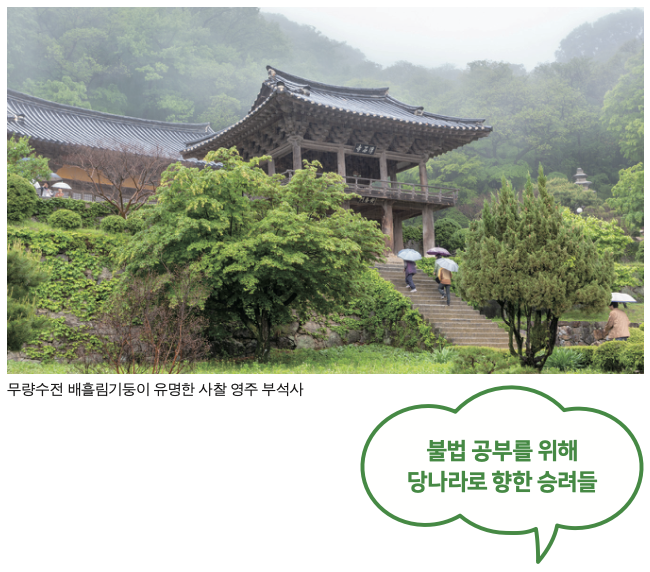 자장에 이어 당나라 유학을 다녀온 또 한 사람의 승려가 바로 신라 불교를 크게 발전시킨 의상이었다. 625년에 태어나 19살에 승려가 된 그는 당나라 유학을 떠났지만 그의 첫 유학길은 신라·고구려 국경에서 고구려군에게 붙잡히며 실패로 돌아갔다. 그로부터 10년 후에 의상은 당나라로 가서 8년간 공부하고 귀국을 결심했는데, 그때 그는 걸음을 몹시 재촉해 신라로 돌아왔다고 한다. 『삼국유사』에는 당시 당나라의 신라 침략 계획을 미리 알리기 위해서였다고 설명한다. 돌아온 이후 그는 젊은 승려들을 가르치고 신라 백성에게 불교를 전파하는 데 앞장서는 한편 신라 땅 곳곳에 많은 절을 세워 나갔다. 그 중 특히 유명한 사찰이 바로 676년 현재의 경상북도 영주시에 세운 부석사이다.