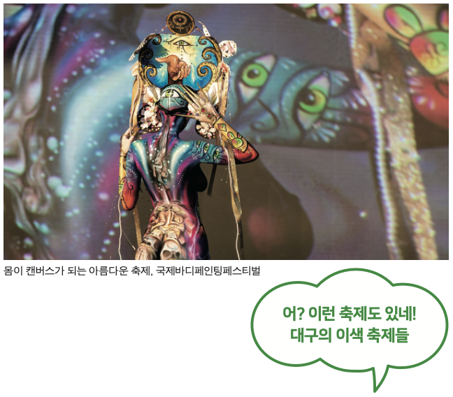 바디페인팅(Body Painting)은 몸을 캔버스로 하여 시각적인 아름다움을 표현하는 예술이다. 대구는 아시아에서 유일하게 바디페인팅을 주제로 한 국제바디페인팅페스티벌이 열리는 도시이다. 바디페인팅대회뿐만 아니라 환상적인 의상과 장식품의 조화로 화려함을 뽐내는 환타지 메이크업 어워드 행사도 볼 만하고, 네일아트 등 뷰티 관련 종사자들을 대상으로 하는 유익한 강의도 진행된다. 매년 8월에 열리는 축제이다.