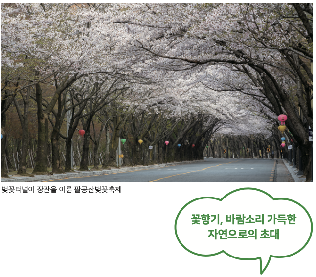 매년 4월 팔공산에선 벚꽃의 교향악이 울려 퍼진다. 2019년 11회를 맞은 팔공산벚꽃축제는 팔공산 동화지구 분수대광장을 중심으로 열린다. 가장 즐거운 볼거리는 축제장~수태골 주차장 구간에 펼쳐진 벚꽃터널이다. 축제에는 벚꽃길 시민걷기대회 행사를 비롯해 야외 공연, 먹거리 부스, 플리마켓, 체험 부스 등 다양한 프로그램이 마련되어있다.