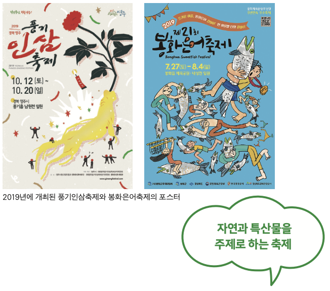 경상북도에는 크고 아름다운 산, 기름진 평야가 많이 있다. 또 여러 고장이 동해안을 끼고 있다. 이런 자연의 풍요로움은 다양한 특산품을 선물해 주었다. 그래서 자연과 특 산품을 주제로 하는 축제들이 많이 열린다.