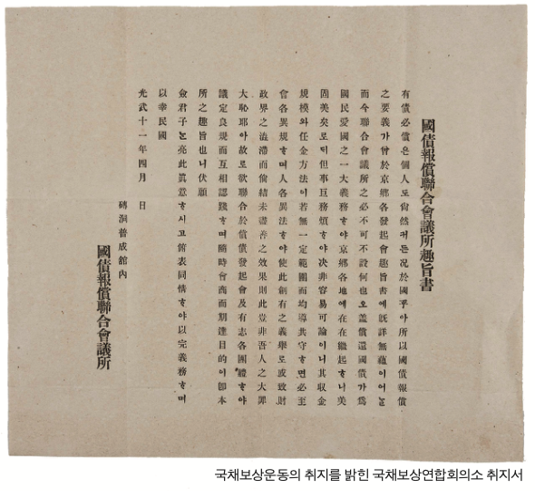 국채보 상운동은 삽시간에 전국으로 전파되었다. 서울에선 국채보상기성회라는 조직 이 만들어졌다. 곧 각계각층의 사람들이 모금에 참여했다. 상인, 노동자, 농민, 부녀자, 군인 등이 참여하는 범국민 운동으로 발전한 것이다.