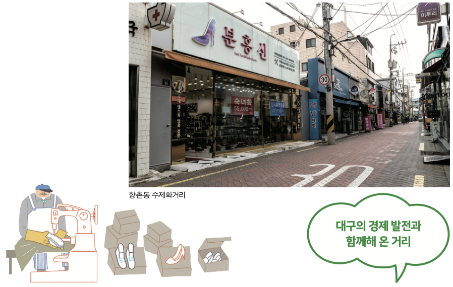 먼저 향촌동엔 수제화거리가 있다. 1970년대에 생긴 약 300m 길이의 거리로, 수제화