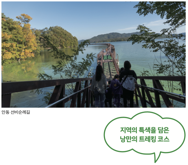 선비는 옛날에 글공부를 많이 하고 품행이 올바른 사람을 일컫던 말이다. 안동 선비순례길은 안동이 예로부터 선비의 고장으로 유명했던 역사를 기념하여 지은 이름이다. 총 9개 구간의 코스로 구성되어 있으며 넓은 안동호의 풍경, 다양한 유교문화 유적을 두루 구경할 수 있는, 총길이가 91km에 이르는 길이다.