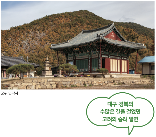 승려가 된 후 대구・ 경북의 여러 길을 걷고 또 걸었던 일연이 마지막으로 머문 곳도 경상북도에 있는 절이었다. 오늘날 군위군에 있는 인각사라는 절이다. 그가 인각사에 온 것은 군위에서 멀지 않은 곳에 계시는 늙은 어머니를 모시기 위한 이유도 있었다. 일연은 인각사에 머물면서 『삼국유사』를 완성하였다. 『삼국유사』는 고대 한반도에 있었던 여러 나라의 역사, 스님과 불교 문화재 이야기, 전설 등을 기록한 책으로 현재 국보로 지정되어 있다.