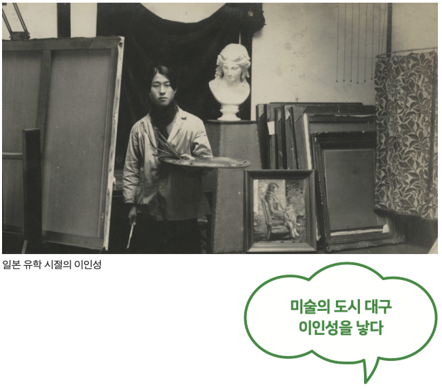 유럽의 회화 사조인 인상파・ 야수파 등의 영향을 받은 그는 수채화와 유화 분야에서 자신만의 개성 있고 과감한 표현법으로 명작을 남겼을 뿐 아니라 이인성양화연구소를 설립해 후진 양성에도 힘쓰는 등 대구의 서양화 보급과 발전에도 큰 공을 남겼다. 안타깝게도 1950년 한국전쟁 시기에 총기 오발 사고로 일찍 세상을 떠났지만, 그가 남긴 그림은 여전히 눈부시다. 이인성을 기념하여 매년 대구에선 독자적인 작품 세계를 선보인 1명의 화가를 선정하여 이인성미술상을 시상하고 있다.