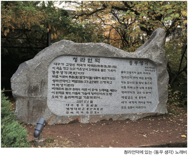 그 후 박태준은 미국에서 합창 지휘를 공부한 후 돌아와 숭실전문학교 교수로 재직하며 국내의 합창음악 발전에 크게 기여했다. 대구에서 1938년 창단한 지역 최초의 일반 합창단(대구합창협회)을 지휘한 인물도 그였다. 현재 청라언덕에는 청소년 시절의 순수한 그리움을 아름답게 표현한 〈동무 생각〉 노래비가 서 있다.