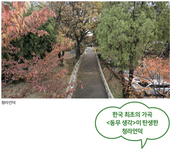 청라언덕은 박태준이 다녔던 계성학교 건너편에 있는 언덕 이름으로, ‘청라’는 푸른 담쟁이를 의미한다. 학창 시절 박태준은 청라언덕으로 난 길을 따라 등교했는데 백합 같은 한 여학생을 마주치곤 했던 곳이 그 언덕길이었다. 이렇게 탄생한 가곡 〈동무 생각〉은 한국음악사 최초의 가곡으로 알려져 있다.