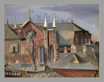 오후의 햇빛 속에 서 있는 계산성당의 풍경을 불투명 수채물감으로 표현했다. 붉고 푸른색이 강조된 가운데 하얀 첨탑이 뚜렷한 대비 효과를 보여 준다. 그림에 등장하는 감나무는 이 그림 때문에 유명해져서 ‘이인성나무’라고 불린다. 계산성당에 가면 그림 속의 나무를 실제로 볼 수 있다.