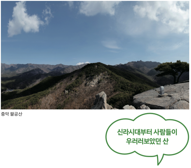 높이 1,192m의 팔공산은 대구를 대표하는 산이다. 신라 사람들은 팔공산을 ‘중악’ 또는 ‘공산’이라고 불렀다. 중악이란, ‘나라(신라)의 중앙에 있는 큰 산’이라는 뜻이다.