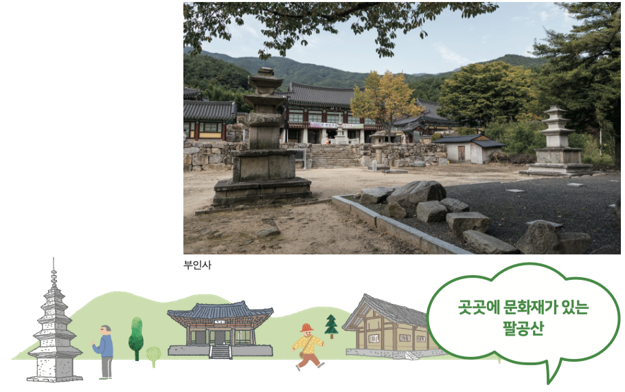 팔공산에는 많은 문화재가 있는 동화사 외에도 산 곳곳에 문화재가 있다. 문화재 종류도 다양하다.