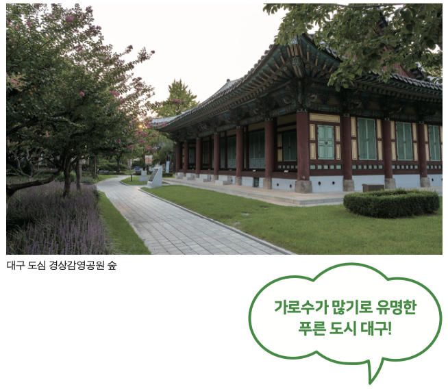 1980년대 초, 대구시청에서는 이런 논의들이 있었다. 그때부터 대구에서는 나무심기 운동과 녹지 공간 확대 작업이 시작되었고, 1996년부터는 ‘푸른 대구 가꾸기 운동’으로 이어졌다. 이 운동을 시작할 당시 대구시는 이런 비전을 세웠다. “대구를 세계적인 숲의도시로 만들어 보자!”