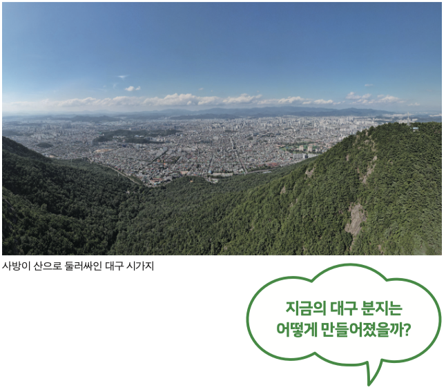 대구는 남쪽과 북쪽이 높은 산지로, 서쪽과 동쪽은 150m 내외의 구릉지로 둘러싸인도시다. 분지 도시인 것이다. 분지 지형은 대구의 기온에 영향을 주었는데, 여름 더위도 그 영향 중 하나다. 그렇다면 대구 분지는 어떻게 만들어진 것일까?