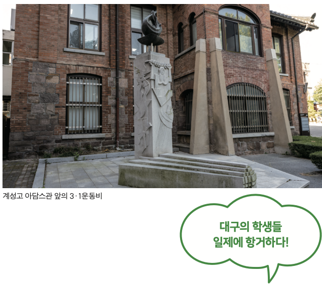 일제강점기 때 학교 교육을 받는 사람은 지금보다 훨씬 적었다. 학생은 선택받은 계층이었다. 그러나 일제의 강압적이고 차별적인 교육에 맞서 많은 학생이 특권과 안정된 미래를 버리고 독립운동의 선봉에 섰다. 3·1 독립만세운동, 6·10 만세운동, 광주학생항일운동 등 조선의 학생들이 주도한 운동은 많다. 그 흐름 속에는 대구 학생들의 노력도 함께였으니, 주요 사건들을 중심으로 알아보자.