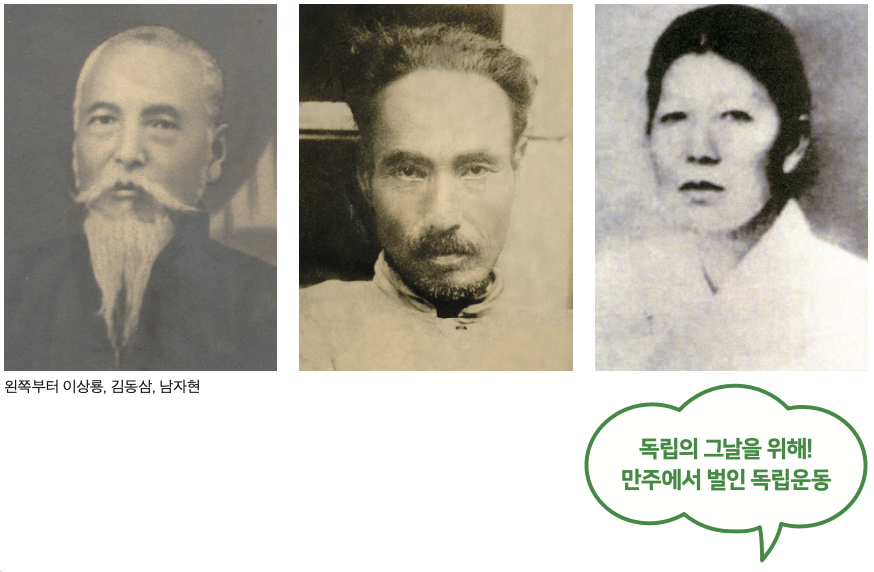 1910년 조선을 완전히 병합한 일본은 감시와 단속을 더욱 강화한다. 국내에서 독립 운동을 펼치기가 매우 어려워졌다. 이때 많은 독립운동가들이 조선의 북쪽 국경 너머에 있는 만주로 건너가 조국의 해방을 위해 몸을 바쳤다. 경상북도에서도 많은 이들이 만주로 향했는데, 안동의 이상룡은 1911년에 일가친척을 이끌고 만주의 서간도로 망명하였다. 1911년에서 1918년까지 그는 서간도 조선 동포들의 경제적 안정을 도우며 신흥강습소라는 학교를 세워 조선인 청년 교육에 노력한다 (훗날 독립군 양성의 핵심 기관인 신흥무관학교로 발전한 곳이다). 이상룡은 1925년 대한민국 임시정부의 국무령에 추대되어 독립운동을 이끌었다. 하지만 슬프게도 그는 조국의 광복을 보지 못한 채 1932년 만주에서 숨을 거둔다. 또 다른 안동 출신 독립운동가로는 김동삼이 있다. 1910년 만주로 망명한 그는 이상룡을 도와 신흥강습소 설립과 독립운동 기지 건설에 앞장섰다. 1919년엔 무장 독립운동 단체인 서로군정서 참모장을 맡아 독립군을 지휘했으나, 1931년 중국 하얼빈에서 일본 경찰에게 체포된다. 재판에서 10년형을 선고받은 그는 해방 전인 1937년 서대문형무소 에서 순국했다.