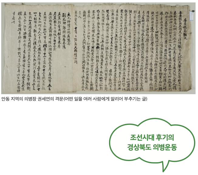 19세기 말, 조선은 외세의 침략으로 위기를 맞았다. 가장 위협적인 나라는 일본이었다. 이 땅에서 점점 더 영향력을 키워 나가던 그들은 조선 정부를 위협하려고 1894년 7월 군대를 동원해 경복궁까지 점령하기에 이른다. 분노한 민중의 저항이 있었다. 그해 7월에서 9월 동안 안동을 중심으로 한 경상북도지역에서 일어난 항일의병운동이 대표적이다. 갑오년(1894)에 일어난 의병이어서 이들을 갑오의병이라고 부른다. 그해 안동과 문경 등에서 모여든 의병 수는 2000여 명에 달했다. 의병 부대는 9월 상주에 주둔한 일본군 부대를 공격하는 용맹함을 보였다. 안타깝게도 전투에서 패하긴 했지만, 갑오의병들의 항거는 조선 말기 일본에 맞선 최초의 의병운동으로 역사적 가치를 인정받고 있다.