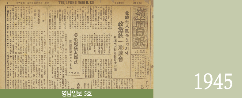 1945년 8·15 해방 후 한국에서는 많은 신문이 창간되었습니다. 영남일보는 1945년 10월 11일 대구 지역의 언론인 등 10명이 힘을 모아 창간하였습니다. 영남일보는 타블로이드판 크기 4면으로 창간호를 냈습니다. 1950년 한국전쟁이 일어났을 때 영남일보는 큰 활약을 했습니다. 전쟁 중에도 영남일보는 대구를 떠나지 않고 계속 신문을 발간했습니다. 덕분에 대구 시민은 물론 대구로 피난 온 많은 국민들 이 전쟁 상황을 알수 있었습니다.