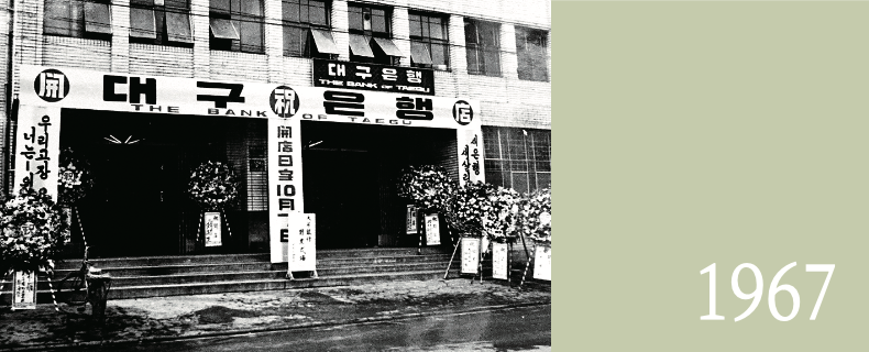 대구가 가진 자랑스러운 최초 기록 중에는 광복 후 대구에 본사를 둔 최초의 지 방은행이 생겼다는 사실도 있습니다. 바로 1967년 10월 7일 설립된 대구은행(현 DGB대구은행)입니다. 대구의 상공인들은 힘을 모아 대구에 본사가 있는 은행 설 립 운동을 추진했습니다. 이런 적극적인 준비 덕분에 정부가 1도 1행(1개 도에 1개 지방 은행) 설립 정책을 결정한 후, 대구에서 가장 먼저 지방은행이 탄생할 수 있었 습니다. 대구은행이 설립되었을 때 박정희 대통령이 은행 탄생을 축하하는 의미로 1호 예금통장을 개설하였습니다.