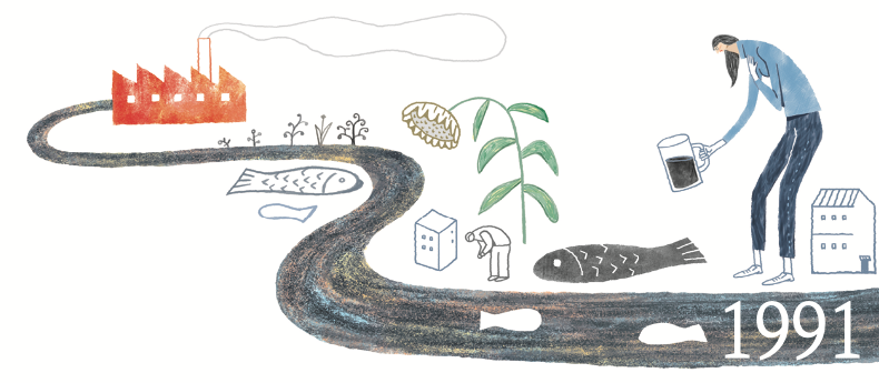 1991년 3월 대구시민을 충격과 공포에 빠뜨린 사건이 일어났습니다. 구미산업단 지에 있는 두산전자에서 유출된 페놀이 낙동강을 통해 대구 취수장에 흘러드는 사건이 발생한 것입니다. 처음 유출된 것은 3월 14일이었습니다. 대구 시민들이 수돗물에서 냄새가 난다고 신고하였고, 지역 언론사의 신속한 취재를 통해 진상이 알려졌습니다.