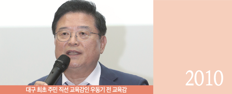 6월 2일 대구에서 치러진 선거에선 대학교수 출신의 우동기 후보가 당선되었습 니다. 교육감 당선 후 4년 동안 대구 교육 발전에 많은 업적을 쌓은 우동기 교육감 은 2014년 선거에서 다시 당선되어 연임에 성공했습니다. 오늘의 역사 1948년 한글학회, 『우리말 도로 찾기』 발행 1957년 청구대학(영남대학교 전신) 강당에서 대구현악회 창단 공연
