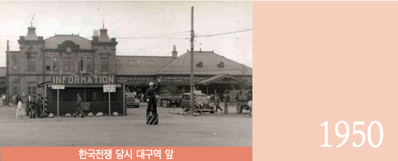 1950년 6월 25일 북한군이 불법 남침함으로써 한국전쟁이 일어났습니다. 3년 넘게 이어진 전쟁은 1953년 7월 27일 체결된 휴전협정으로 일단락되었습니다. 한 국전쟁은 대구에 많은 역사의 흔적을 남겼습니다. 전쟁 발발 후 많은 피난민이 대 구로 왔고 대구시 외곽 곳곳에 피난촌이 만들어졌습니다.