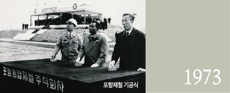 1973년 6월 9일 포항 1고로가 첫 출선하였고 같은 해 7월 3일 포항 1기 설비를 종합 준공하였습니다. 수많은 사람들의 수고와 노력으로 포항제철은 이듬해부터 한국 경제성장의 주역이 되었습니다. 1974년 12월 30일 포항제철은 수출액 1억 불 을 달성하였고 1976년에는 2기 설비를 종합 준공하였습니다. 오늘의 역사 1973년 불국사 복원사업 완료 2012년 금호강 산격야영장 개장
