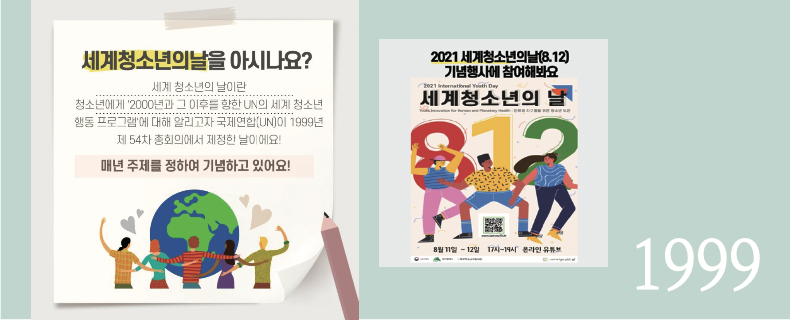 1991년 오스트리아 빈에서 열린 세계 청소년 회의에 참석한 학생들이 세계 청소 년의 날을 만들 것을 제안하였습니다. 그리고 국제연합(UN)은 1999년 세계 모든 청소년들의 더 나은 삶을 위해 인류가 함께 노력하자는 것을 목적으로 하는 세계 청소년의 날을 제정하였습니다. UN은 해마다 주제를 정해 이 날을 기념하고 있습 니다. 2021년의 주제는 ‘인류와 지구별을 위한 청소년의 혁신’이었습니다. 오늘의 역사 1993년 김영삼 대통령, 금융실명제 발표 2008년 서상돈 고택, 현재의 위치로 이전 복원되어 개관